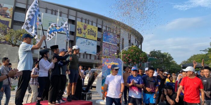 Batam – Kepala BP Batam, Amsakar Achmad dan Wakil Kepala BP Batam Li Claudia Chandra melepas peserta jalan santai atau fun walk