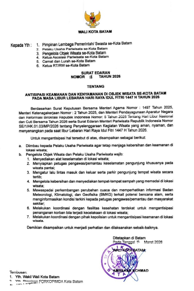 Surat edaran yang diterbitkan oleh Wali Kota Batam, Amsakar Achmad, tersebut ditujukan kepada pimpinan lembaga pemerintah maupun swasta, pelaku usaha pariwisata, pengelola objek wisata, asosiasi pariwisata, camat dan lurah, hingga ketua RT/RW se-Kota Batam.
