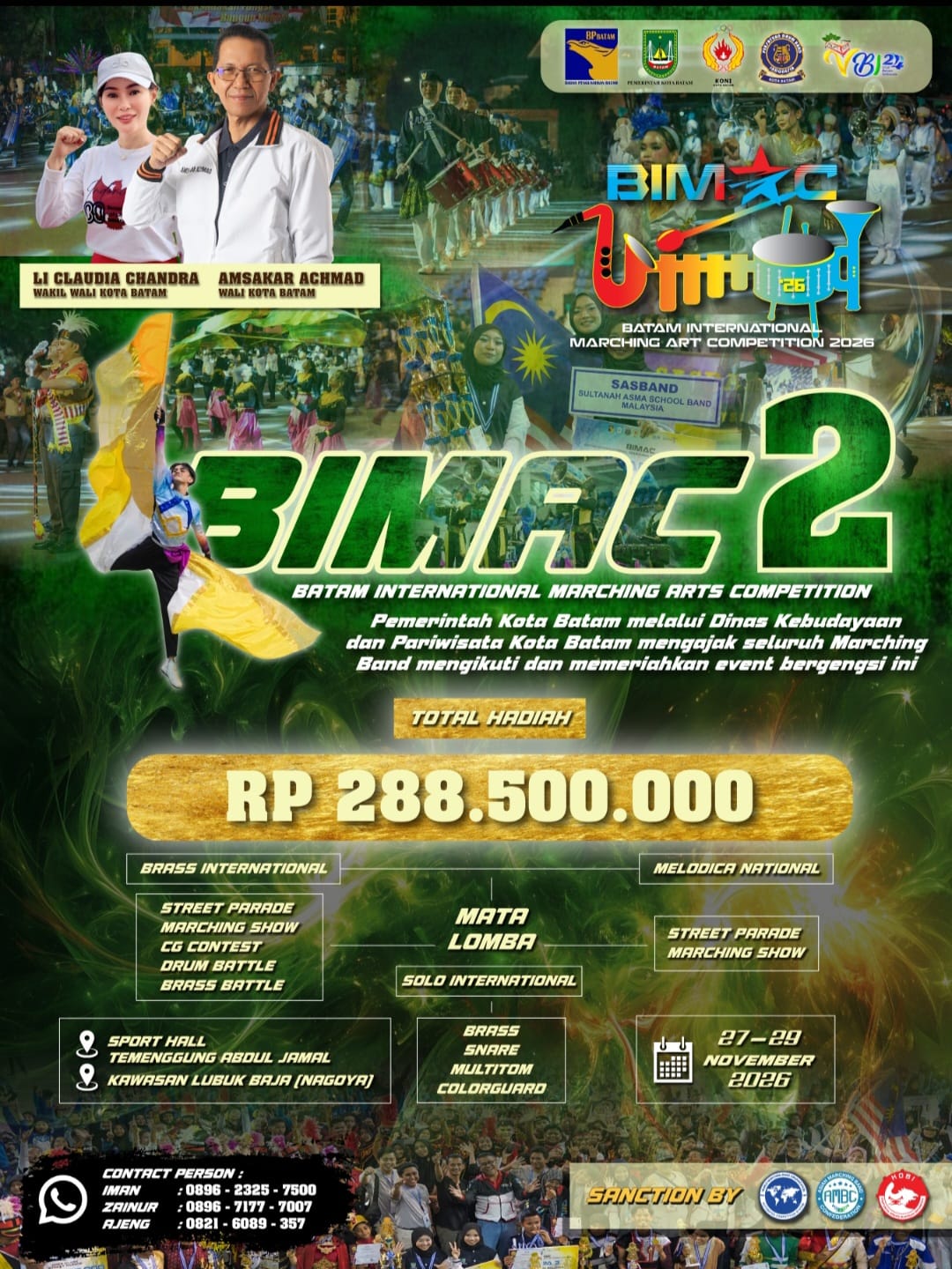 “Kami sangat mendukung pelaksanaan BIMAC 2026 sebagai ajang turnamen tingkat internasional. Kami berharap kegiatan ini dapat diikuti oleh banyak unit marching band, baik dari dalam maupun luar negeri, termasuk dari Batam dan Kepulauan Riau,” ujarnya.