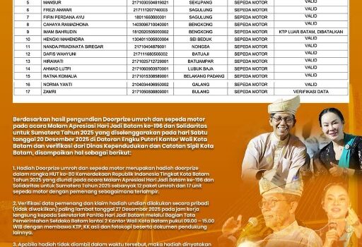 Sementara Dewi Nursila dan Zamri masih dalam proses verifikasi data. Selain itu, satu peserta undian sepeda motor atas nama Imam Bahrudin (Bengkong) dinyatakan dibatalkan karena menggunakan KTP luar Kota Batam dan tidak memenuhi persyaratan administrasi sesuai ketentuan panitia.