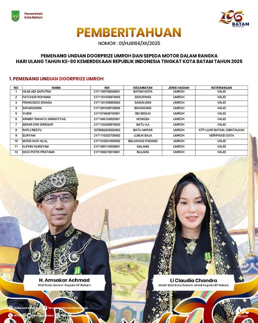 rangka HUT ke-80 Kemerdekaan Republik Indonesia Tingkat Kota Batam Tahun 2025 yang dibagikan saat HJB ke-196.