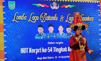 Batam – Lomba Lagu Batamku dan Lagu Daerah Nusantara dalam rangka HUT Korpri ke-54, berlangsung meriah. Pada sesi pertama, mereka membawakan “Lagu Batamku” ciptaan mantan Wali Kota Batam, Ahmad Dahlan dan dilanjutkab lagu daerah.