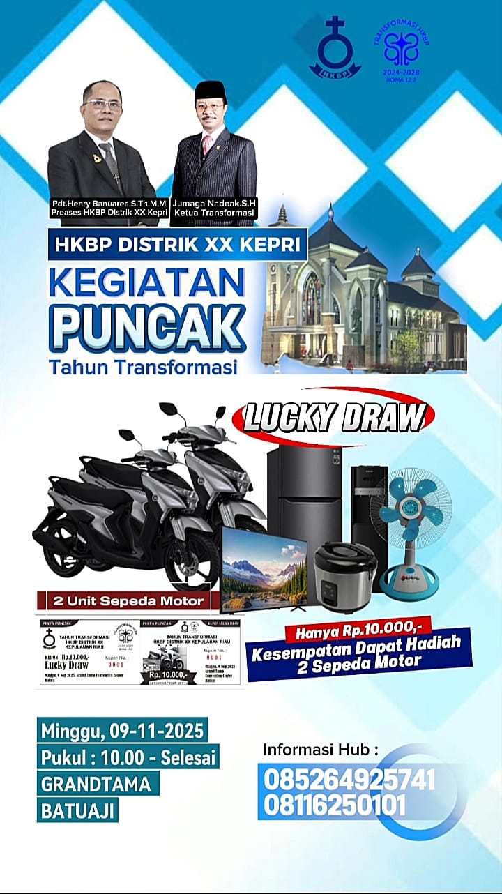 Batam – Panitia Tahun Transformasi HKBP Distrik XX Kepri, mengajak warga gereja itu untuk meramaikan puncak kegiatan tahunan itu. Dimana, puncak kegiatan itu akan berlangsung, Minggu (9/11/2025), mulai pukul 10.00 sampai selesai, di Grandtama Batuaji.